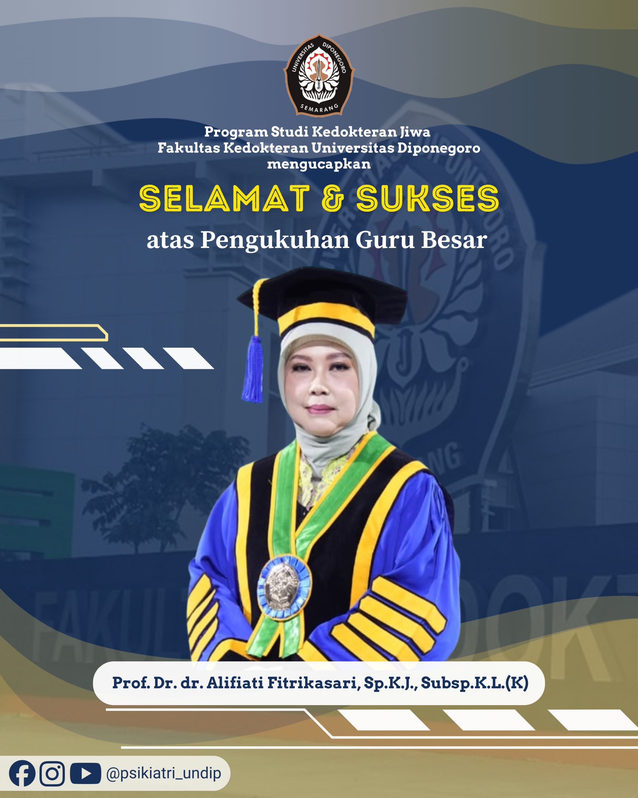 Selamat mengemban amanah baru sebagai Guru Besar kepada Prof. Dr. dr. Alifiati Fitrikasari, Sp.K.J., Subsp.K.L.(K). Gelar tertinggi di bidang akademik ini adalah buah dari dedikasi tanpa henti, ketajaman intelektual, dan pengabdian yang tulus untuk dunia psikiatri.